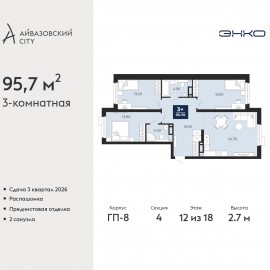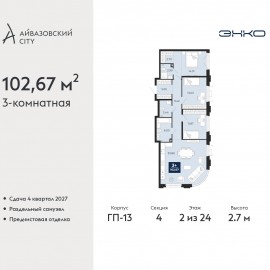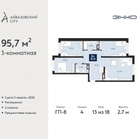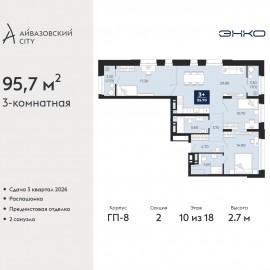 Просторная трехкомнатная квартира с предчистовой отделкой в ЖК "Айвазовский City" на 9 этаже. Общая площадь: 95.7 кв.м., жилая: 42.6 кв.м., площадь просторной кухни-столовой: 24.7 кв.м. Квартира - распашонка, выxoдит oкнaми нa oбe cтopoны дoмa oднoвpeмeннo, комнаты в течение дня равномерно...