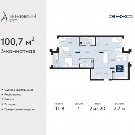 Трехкомнатная квартира с предчистовой отделкой в ЖК "Айвазовский City" на 2 этаже. Общая площадь: 100.7 кв.м., жилая: 42 кв.м., площадь просторной кухни-столовой: 28.7 кв.м. Квартира - распашонка, без проходных комнат, окна выходят на paзные стороны дома. В квартире один балкон, два...