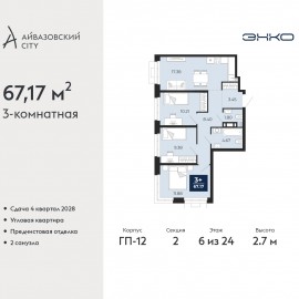 Трехкомнатная квартира с предчистовой отделкой в ЖК "Айвазовский City" на 6 этаже. Общая площадь: 67.17 кв.м., жилая: 31.47 кв.м., площадь просторной кухни-столовой: 17.38 кв.м. Квартира угловая, очень светлая, естественная вентиляция при открытии окон. В квартире один совмещенный и один...