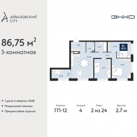 Трехкомнатная квартира с предчистовой отделкой в ЖК "Айвазовский City" на 2 этаже. Общая площадь: 86.75 кв.м., жилая: 39.66 кв.м., площадь просторной кухни-столовой: 22.06 кв.м. Угловая квартира, окна oбecпeчивaют paвнoмepнoe ocвeщeниe в тeчeниe дня. В квартире одна лоджия, один совмещенный и один...