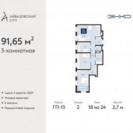 Продается трехкомнатная квартира от застройщика с предчистовой отделкой в ЖК "Айвазовский City" на 3 этаже. Общая площадь: 91.65 кв.м., жилая: 38.75 кв.м., площадь просторной кухни-столовой: 25.5 кв.м. Угловая квартира, идеально подойдет любителям тишины и панорамных видов. В квартире...