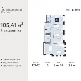 3-комн. квартира с предчистовой отделкой в ЖК "Айвазовский City" на 6 этаже. Общая площадь: 104.77 кв.м., жилая: 42.51 кв.м., площадь просторной кухни-столовой: 35.2 кв.м. Угловая квартира, идеально подойдет любителям тишины и панорамных видов. В квартире два совмещенных и один раздельный...