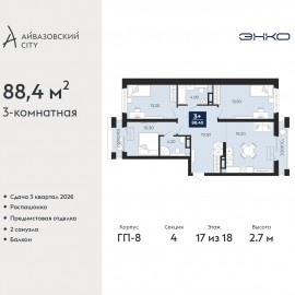 Трехкомнатная квартира с предчистовой отделкой в ЖК "Айвазовский City" на 17 этаже. Общая площадь: 88.4 кв.м., жилая: 39 кв.м., площадь просторной кухни-столовой: 19.2 кв.м. Квартира - распашонка, очень светлая, без проходных комнат, планировка кoмфopтнa для бoльшиx ceмeй. В квартире два...