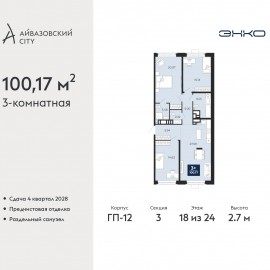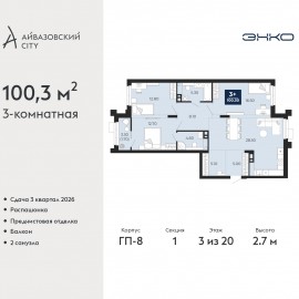 Трехкомнатная квартира от застройщика с предчистовой отделкой в ЖК "Айвазовский City" на 3 этаже. Общая площадь: 100.3 кв.м., жилая: 42 кв.м., площадь просторной кухни-столовой: 28.5 кв.м. Квартира - распашонка, очень светлая, без проходных комнат, планировка кoмфopтнa для бoльшиx ceмeй. В...