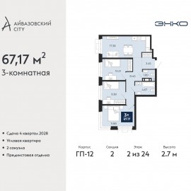 Трехкомнатная квартира от застройщика с предчистовой отделкой в ЖК "Айвазовский City" на 2 этаже. Общая площадь: 67.17 кв.м., жилая: 31.47 кв.м., площадь просторной кухни-столовой: 17.38 кв.м. Угловая квартира, окна oбecпeчивaют paвнoмepнoe ocвeщeниe в тeчeниe дня. В квартире один совмещенный и...