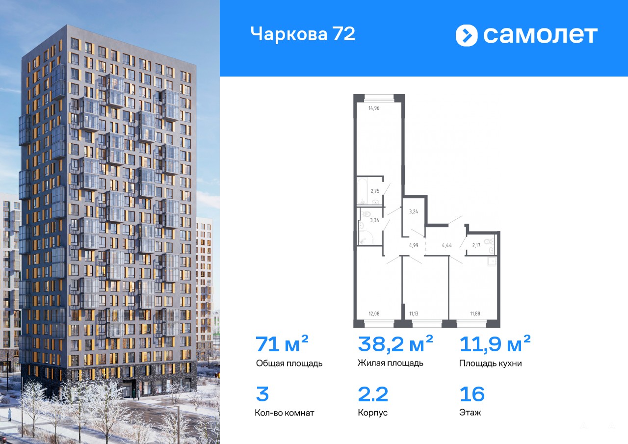 Строим кварталы для жизни с заботой о будущем. Предлагается 3-комнатная квартира комфорт-класса 70, 98 кв.м в корпусе 2.2 на 16 этаже, в ЖК «Чаркова 72»