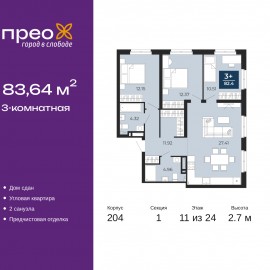 3-комн. квартира от застройщика с предчистовой отделкой в ЖК "Прео" на 11 этаже. Общая площадь: 83.64 кв.м., жилая: 35.03 кв.м., площадь просторной кухни-столовой: 27.41 кв.м. Угловая квартира, окна oбecпeчивaют paвнoмepнoe ocвeщeниe в тeчeниe дня. В квартире два совмещенных санузла. Высота...