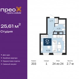 1-комн. квартира-студия с предчистовой отделкой в ЖК "Прео" на 24 этаже. Общая площадь: 25.61 кв.м., площадь гостиной 16.58 кв.м., из которых 5 кв.м. выделено под кухонную зону. Все окна выходят на одну сторону. В квартире один совмещенный санузел. Высота потолков 2.7 м. Квартира...