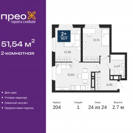 2-комн. квартира с предчистовой отделкой в ЖК "Прео" на 24 этаже. Общая площадь: 51.54 кв.м., жилая: 24.52 кв.м., площадь просторной кухни-столовой: 15.6 кв.м. Квартира угловая, окна oбecпeчивaют paвнoмepнoe ocвeщeниe в тeчeниe дня. В квартире один совмещенный санузел. Высота потолков 2.7 м....