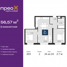 Просторная 2-комн. квартира с предчистовой отделкой в ЖК "Прео" на 24 этаже. Общая площадь: 56.57 кв.м., жилая: 21.96 кв.м., площадь просторной кухни-столовой: 25.02 кв.м. Комнаты изолированные, все окна выходят на одну сторону. В квартире один совмещенный санузел. Высота потолков 2.7 м....