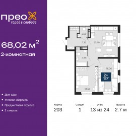 Двухкомнатная квартира с предчистовой отделкой в ЖК "Прео" на 13 этаже. Общая площадь: 68.02 кв.м., жилая: 29.46 кв.м., площадь просторной кухни-столовой: 23.79 кв.м. Угловая квартира, очень светлая, естественная вентиляция при открытии окон. В квартире один совмещенный и один...