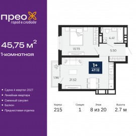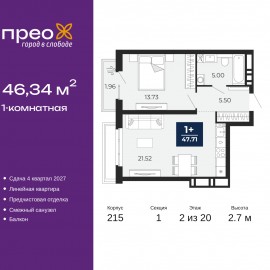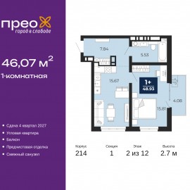 1-комн. квартира с предчистовой отделкой в ЖК "Прео" на 2 этаже. Общая площадь: 46.34 кв.м., жилая: 13.73 кв.м., площадь просторной кухни-столовой: 21.52 кв.м. Все окна выходят на одну сторону. В квартире один балкон, один совмещенный санузел. Высота потолков 2.7 м. Квартира находится в...