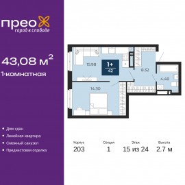 Продается 1-комн. квартира с предчистовой отделкой в ЖК "Прео" на 15 этаже. Общая площадь: 43.08 кв.м., жилая: 14 кв.м., площадь просторной кухни-столовой: 15.98 кв.м. Все окна выходят на одну сторону. В квартире один совмещенный санузел. Высота потолков 2.7 м. Квартира находится в...