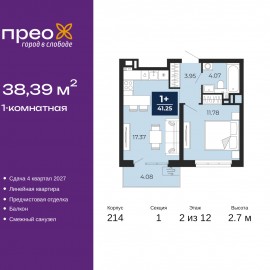 1-комн. квартира с предчистовой отделкой в ЖК "Прео" на 2 этаже. Общая площадь: 38.39 кв.м., жилая: 11.78 кв.м., площадь просторной кухни-столовой: 17.37 кв.м. Все окна выходят на одну сторону. В квартире один балкон, один совмещенный санузел. Высота потолков 2.7 м. Дом монолитный,...