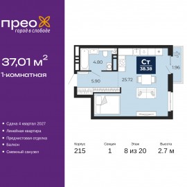 1-комн. квартира с предчистовой отделкой в ЖК "Прео" на 8 этаже. Общая площадь: 37.01 кв.м., жилая: 20.72 кв.м., площадь кухни: 5 кв.м. Все окна выходят на одну сторону. В квартире один балкон, один совмещенный санузел. Высота потолков 2.7 м. Квартира находится в корпусе 215. Дом...