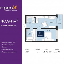 1-комн. квартира с предчистовой отделкой в ЖК "Прео" на 13 этаже. Общая площадь: 40.94 кв.м., жилая: 15.08 кв.м., площадь просторной кухни-столовой: 14.08 кв.м. Все окна выходят на одну сторону. В квартире один балкон, один совмещенный санузел. Высота потолков 2.7 м. Дом монолитный,...
