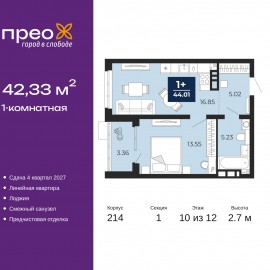 Однокомнатная квартира с предчистовой отделкой в ЖК "Прео" на 10 этаже. Общая площадь: 42.33 кв.м., жилая: 13.55 кв.м., площадь просторной кухни-столовой: 16.85 кв.м. Все окна выходят на одну сторону. В квартире одна лоджия, один совмещенный санузел. Высота потолков 2.7 м. Дом монолитный,...
