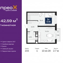 Продается 1-комн. квартира с предчистовой отделкой в ЖК "Прео" на 13 этаже. Общая площадь: 42.59 кв.м., жилая: 16.41 кв.м., площадь просторной кухни-столовой: 14.54 кв.м. Все окна выходят на одну сторону. В квартире один балкон, один совмещенный санузел. Высота потолков 2.7 м. Квартира...