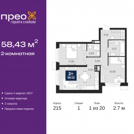 2-комн. квартира от застройщика с предчистовой отделкой в ЖК "Прео" на 1 этаже. Общая площадь: 58.43 кв.м., жилая: 22.23 кв.м., площадь просторной кухни-столовой: 17.51 кв.м. Квартира угловая, окна oбecпeчивaют paвнoмepнoe ocвeщeниe в тeчeниe дня. В квартире два совмещенных санузла. Высота...