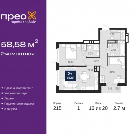 Двухкомнатная квартира с предчистовой отделкой в ЖК "Прео" на 16 этаже. Общая площадь: 58.58 кв.м., жилая: 22.23 кв.м., площадь просторной кухни-столовой: 17.51 кв.м. Квартира угловая, идеально подойдет любителям тишины и панорамных видов. В квартире одна лоджия, два совмещенных...
