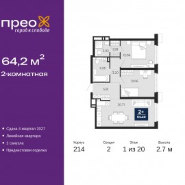 2-комн. квартира с предчистовой отделкой в ЖК "Прео" на 1 этаже. Общая площадь: 64.2 кв.м., жилая: 24.12 кв.м., площадь просторной кухни-столовой: 20.71 кв.м. Комнаты изолированные, все окна выходят на одну сторону. В квартире два совмещенных санузла. Высота потолков 2.7 м. Дом...