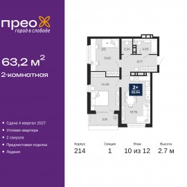 Продается 2-комн. квартира от застройщика с предчистовой отделкой в ЖК "Прео" на 10 этаже. Общая площадь: 63.2 кв.м., жилая: 27.69 кв.м., площадь просторной кухни-столовой: 18.76 кв.м. Квартира угловая, очень светлая, естественная вентиляция при открытии окон. В квартире одна лоджия,...
