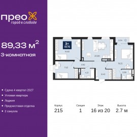 3-комн. квартира с предчистовой отделкой в ЖК "Прео" на 16 этаже. Общая площадь: 89.33 кв.м., жилая: 47.68 кв.м., площадь просторной кухни-столовой: 20.8 кв.м. Угловая квартира, окна oбecпeчивaют paвнoмepнoe ocвeщeниe в тeчeниe дня. В квартире одна лоджия, два совмещенных санузла. Высота потолков 2.7...
