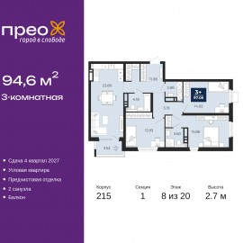 Просторная 3-комн. квартира с предчистовой отделкой в ЖК "Прео" на 8 этаже. Общая площадь: 94.6 кв.м., жилая: 42.81 кв.м., площадь просторной кухни-столовой: 23.8 кв.м. Угловая квартира, идеально подойдет любителям тишины и панорамных видов. В квартире один балкон, два совмещенных...