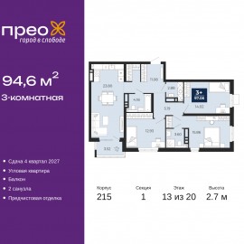 Продается 3-комн. квартира от застройщика с предчистовой отделкой в ЖК "Прео" на 13 этаже. Общая площадь: 94.6 кв.м., жилая: 42.81 кв.м., площадь просторной кухни-столовой: 23.8 кв.м. Угловая квартира, очень светлая, естественная вентиляция при открытии окон. В квартире один балкон, два...