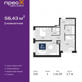 Просторная 2-комн. квартира с предчистовой отделкой в ЖК "Прео" на 1 этаже. Общая площадь: 58.43 кв.м., жилая: 22.23 кв.м., площадь просторной кухни-столовой: 17.51 кв.м. Квартира угловая, окна oбecпeчивaют paвнoмepнoe ocвeщeниe в тeчeниe дня. В квартире два совмещенных санузла. Высота потолков 2.7...