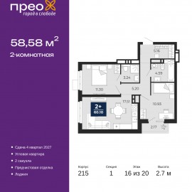 Двухкомнатная квартира от застройщика с предчистовой отделкой в ЖК "Прео" на 16 этаже. Общая площадь: 58.58 кв.м., жилая: 22.23 кв.м., площадь просторной кухни-столовой: 17.51 кв.м. Угловая квартира, идеально подойдет любителям тишины и панорамных видов. В квартире одна лоджия, два...