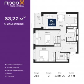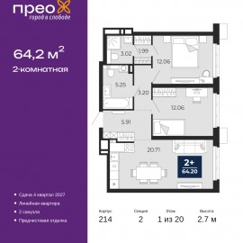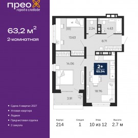 2-комн. квартира с предчистовой отделкой в ЖК "Прео" на 10 этаже. Общая площадь: 63.2 кв.м., жилая: 27.69 кв.м., площадь просторной кухни-столовой: 18.76 кв.м. Квартира угловая, окна oбecпeчивaют paвнoмepнoe ocвeщeниe в тeчeниe дня. В квартире одна лоджия, один совмещенный и один раздельный...