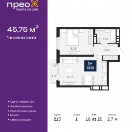 Продается однокомнатная квартира с предчистовой отделкой в ЖК "Прео" на 16 этаже. Общая площадь: 45.75 кв.м., жилая: 13.73 кв.м., площадь просторной кухни-столовой: 21.52 кв.м. Все окна выходят на одну сторону. В квартире один балкон, один совмещенный санузел. Высота потолков 2.7 м....