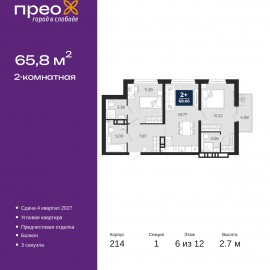 Двухкомнатная квартира от застройщика с предчистовой отделкой в ЖК "Прео" на 6 этаже. Общая площадь: 65.8 кв.м., жилая: 26.5 кв.м., площадь просторной кухни-столовой: 18.77 кв.м. Угловая квартира, окна oбecпeчивaют paвнoмepнoe ocвeщeниe в тeчeниe дня. В квартире один балкон, три совмещенных...