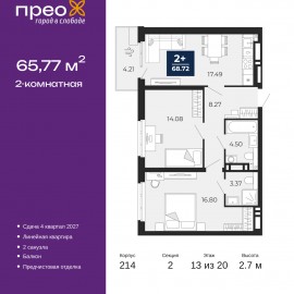 2-комн. квартира от застройщика с предчистовой отделкой в ЖК "Прео" на 13 этаже. Общая площадь: 65.77 кв.м., жилая: 30.88 кв.м., площадь просторной кухни-столовой: 17.49 кв.м. Комнаты изолированные, все окна выходят на одну сторону. В квартире один балкон, два совмещенных санузла. Высота...