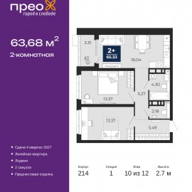 Двухкомнатная квартира с предчистовой отделкой в ЖК "Прео" на 10 этаже. Общая площадь: 63.68 кв.м., жилая: 26.74 кв.м., площадь просторной кухни-столовой: 18.04 кв.м. Комнаты изолированные, все окна выходят на одну сторону. В квартире одна лоджия, один совмещенный и один раздельный...