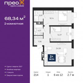 2-комн. квартира с предчистовой отделкой в ЖК "Прео" на 12 этаже. Общая площадь: 61.47 кв.м., жилая: 24.12 кв.м., площадь просторной кухни-столовой: 16.37 кв.м. Комнаты изолированные, все окна выходят на одну сторону. В квартире одна лоджия, два совмещенных санузла. Высота потолков 2.7 м....