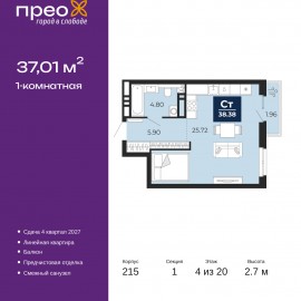 Просторная однокомнатная квартира с предчистовой отделкой в ЖК "Прео" на 4 этаже. Общая площадь: 37.01 кв.м., жилая: 20.72 кв.м., площадь кухни: 5 кв.м. Все окна выходят на одну сторону. В квартире один балкон, один совмещенный санузел. Высота потолков 2.7 м. Квартира находится в...