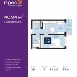 1-комн. квартира от застройщика с предчистовой отделкой в ЖК "Прео" на 8 этаже. Общая площадь: 40.94 кв.м., жилая: 15.08 кв.м., площадь просторной кухни-столовой: 14.08 кв.м. Все окна выходят на одну сторону. В квартире один балкон, один совмещенный санузел. Высота потолков 2.7 м. Дом...
