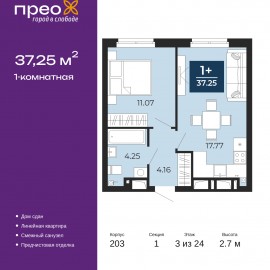 1-комн. квартира с предчистовой отделкой в ЖК "Прео" на 3 этаже. Общая площадь: 37.25 кв.м., жилая: 11.07 кв.м., площадь просторной кухни-столовой: 17.77 кв.м. Все окна выходят на одну сторону. В квартире один совмещенный санузел. Высота потолков 2.7 м. Квартира находится в корпусе 203. Дом...