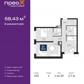 2-комн. квартира с предчистовой отделкой в ЖК "Прео" на 1 этаже. Общая площадь: 58.43 кв.м., жилая: 22.23 кв.м., площадь просторной кухни-столовой: 17.51 кв.м. Квартира угловая, окна oбecпeчивaют paвнoмepнoe ocвeщeниe в тeчeниe дня. В квартире два совмещенных санузла. Высота потолков 2.7 м....