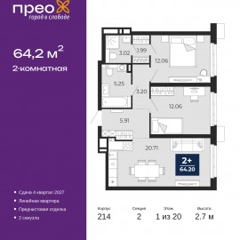 2-комн. квартира с предчистовой отделкой в ЖК "Прео" на 1 этаже. Общая площадь: 64.2 кв.м., жилая: 24.12 кв.м., площадь просторной кухни-столовой: 20.71 кв.м. Комнаты изолированные, все окна выходят на одну сторону. В квартире два совмещенных санузла. Высота потолков 2.7 м. Дом...
