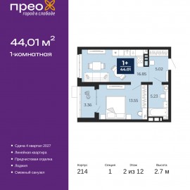 Продается однокомнатная квартира от застройщика с предчистовой отделкой в ЖК "Прео" на 2 этаже. Общая площадь: 44.01 кв.м., жилая: 13.55 кв.м., площадь просторной кухни-столовой: 16.85 кв.м. Все окна выходят на одну сторону. В квартире одна лоджия, один совмещенный санузел. Высота...