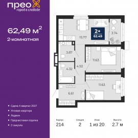 Двухкомнатная квартира от застройщика с предчистовой отделкой в ЖК "Прео" на 1 этаже. Общая площадь: 62.49 кв.м., жилая: 23.26 кв.м., площадь просторной кухни-столовой: 15.77 кв.м. Угловая квартира, очень светлая, естественная вентиляция при открытии окон. В квартире одна лоджия, один...