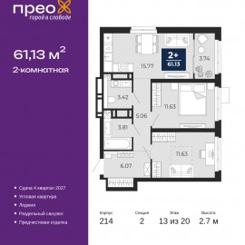 Просторная 2-комн. квартира с предчистовой отделкой в ЖК "Прео" на 13 этаже. Общая площадь: 61.13 кв.м., жилая: 23.26 кв.м., площадь просторной кухни-столовой: 15.77 кв.м. Квартира угловая, очень светлая, естественная вентиляция при открытии окон. В квартире одна лоджия, один раздельный...