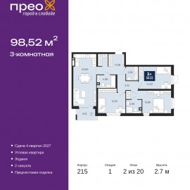 Продается 3-комн. квартира с предчистовой отделкой в ЖК "Прео" на 2 этаже. Общая площадь: 98.52 кв.м., жилая: 42.81 кв.м., площадь просторной кухни-столовой: 23.8 кв.м. Угловая квартира, идеально подойдет любителям тишины и панорамных видов. В квартире одна лоджия, два совмещенных...