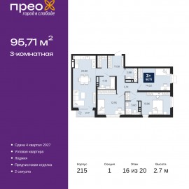 Трехкомнатная квартира с предчистовой отделкой в ЖК "Прео" на 16 этаже. Общая площадь: 95.71 кв.м., жилая: 42.81 кв.м., площадь просторной кухни-столовой: 23.8 кв.м. Угловая квартира, идеально подойдет любителям тишины и панорамных видов. В квартире одна лоджия, два совмещенных...