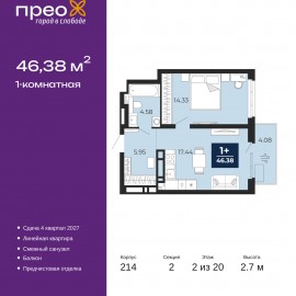 1-комн. квартира от застройщика с предчистовой отделкой в ЖК "Прео" на 2 этаже. Общая площадь: 46.38 кв.м., жилая: 14.33 кв.м., площадь просторной кухни-столовой: 17.44 кв.м. Все окна выходят на одну сторону. В квартире один балкон, один совмещенный санузел. Высота потолков 2.7 м. Дом...