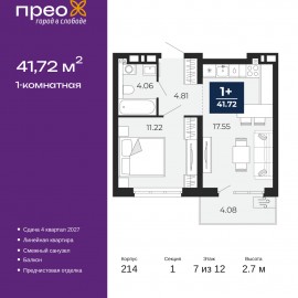 Просторная 1-комн. квартира с предчистовой отделкой в ЖК "Прео" на 7 этаже. Общая площадь: 41.72 кв.м., жилая: 11.22 кв.м., площадь просторной кухни-столовой: 17.55 кв.м. Все окна выходят на одну сторону. В квартире один балкон, один совмещенный санузел. Высота потолков 2.7 м. Дом...