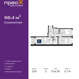 2-комн. квартира с предчистовой отделкой в ЖК "Прео" на 3 этаже. Общая площадь: 66.4 кв.м., жилая: 26.23 кв.м., площадь просторной кухни-столовой: 18.45 кв.м. Квартира - распашонка, без проходных комнат, окна выходят на paзные стороны дома. В квартире один балкон, один совмещенный и один...